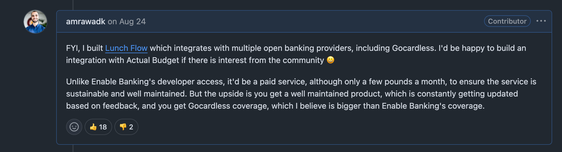I have been a fan of Actual Budget’s for a long time! Even though it didn’t work for me due to a lack of multi-currency support. And when I reached out to the community offering Lunch Flow support as a GoCardless alternative, both the maintainers and the users were very welcoming!